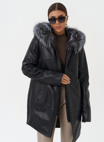 Утепленное пальто из натуральной кожи украсит ваши дождливые будни. Капюшон с отделкой из меха чернобурки согреет в ветреную погоду. Удобный фасон позволит совершать длинные прогулки. Утеплитель обеспечит комфортное пребывание на улице. С помощью молний по бокам изделия вы можете отрегулировать низ модели.