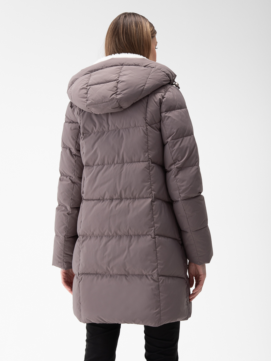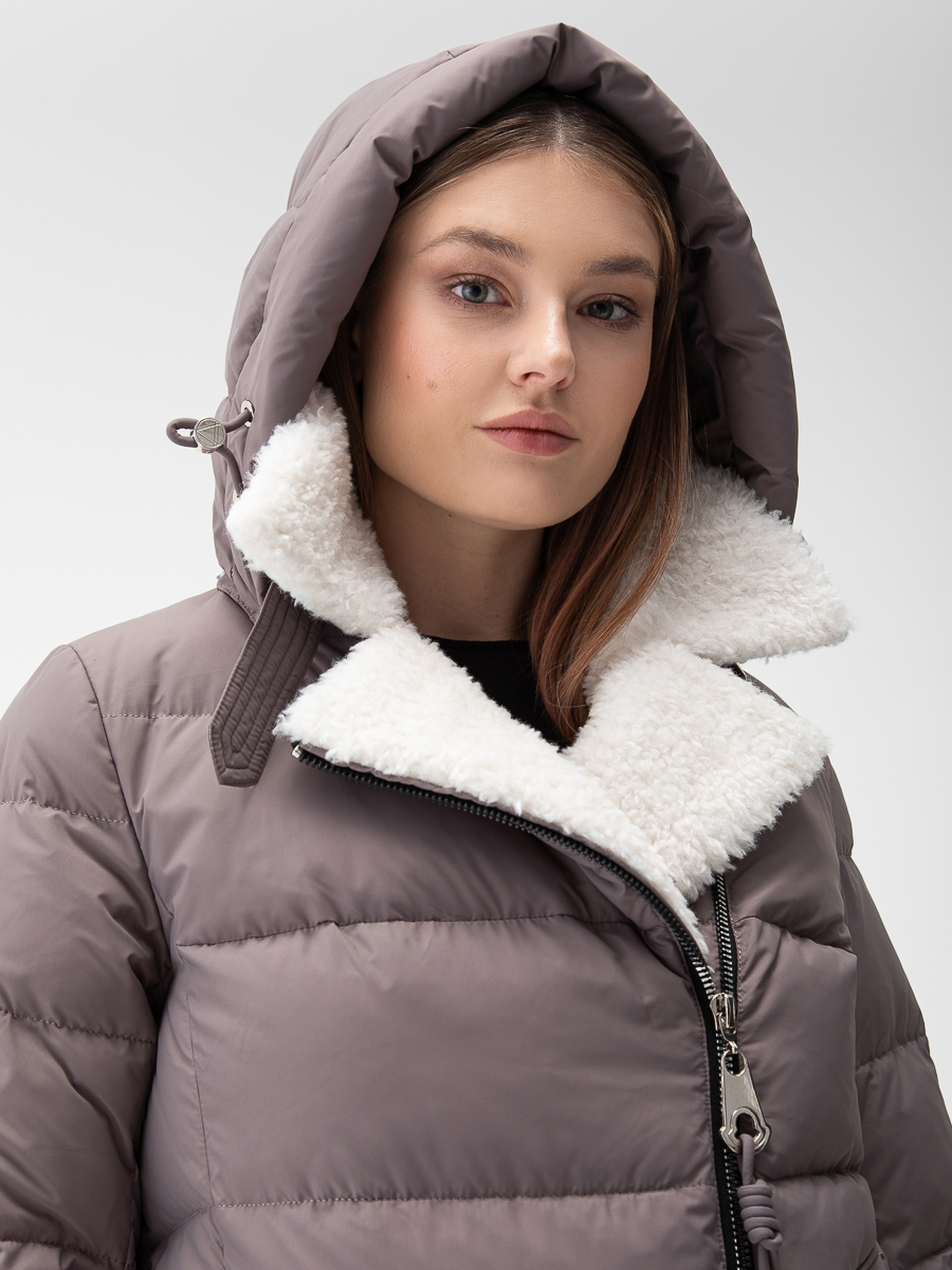 Крой воротника - съёмный капюшон, отделка эко мех